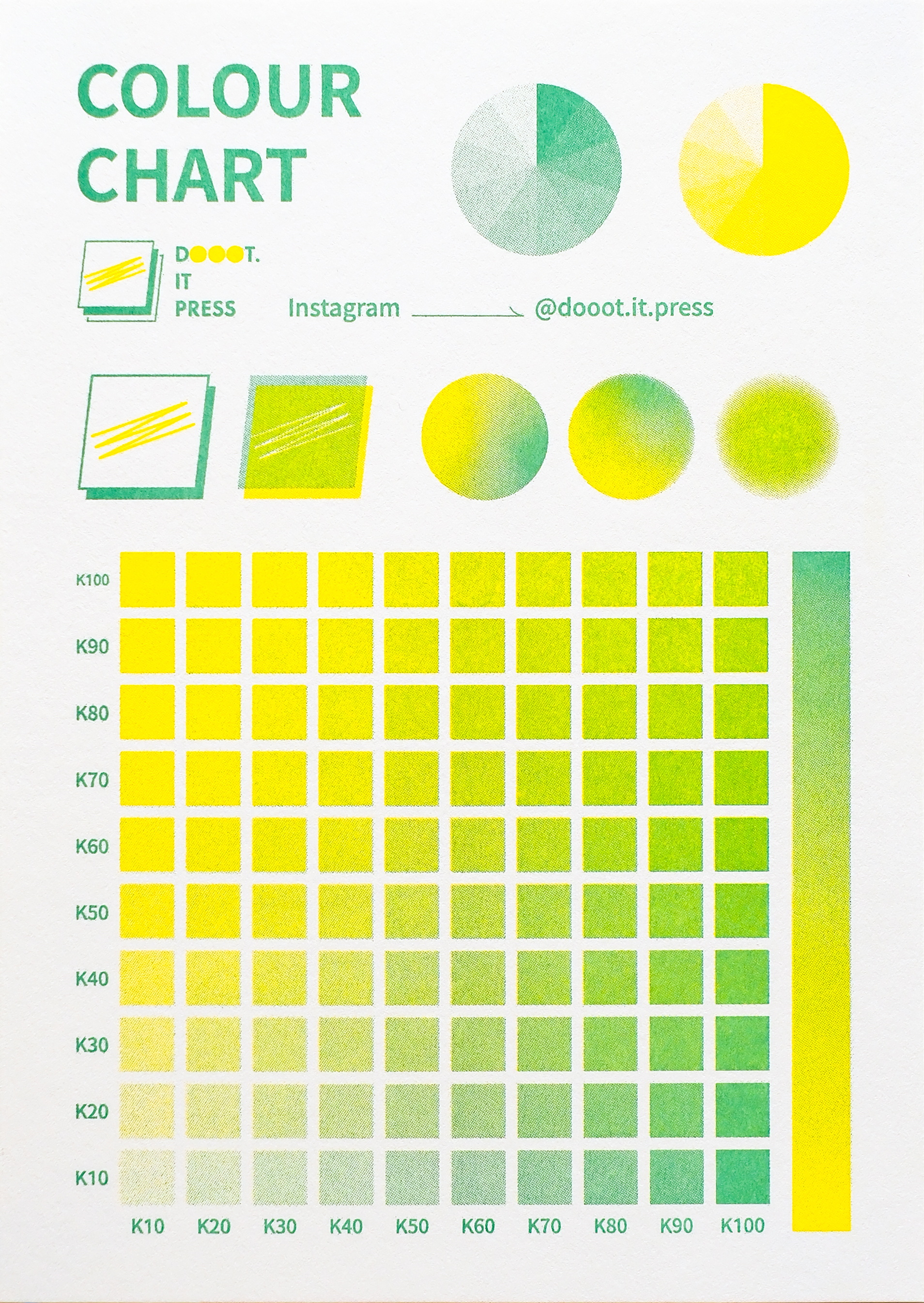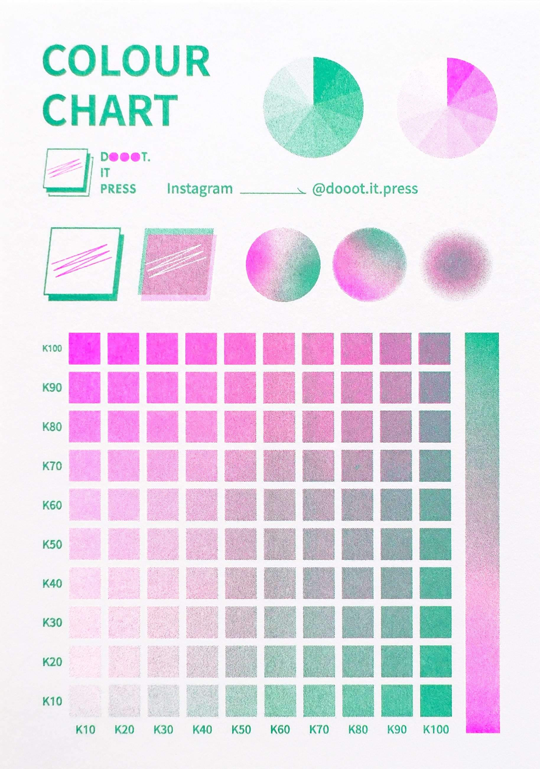 製作稿件前可參考色樣卡、網點卡、以及混色卡之印刷效果來做相應的搭配,也由於孔版印刷『每一張都不同的獨特性』,成品的印刷效果皆以最終呈現為主。